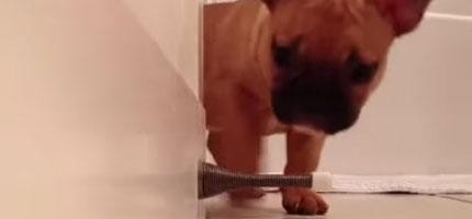 這隻法國鬥牛犬寶寶發現到了彈簧門檔後…這世界忽然更美好了。