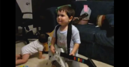 當這名2歲小男生彈奏電玩吉他時,他的120%超搖滾投入表情會讓你的臉融化掉!