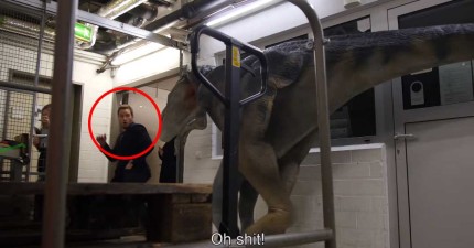 「星爵」克里斯普瑞特走進一個裝滿攝影機的房間,結果兩隻迅猛龍衝出來把他嚇到坐倒在地…!