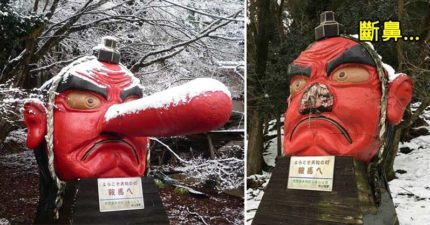 巨大天狗慘遭大雪「硬生生弄斷鼻子」,日本人「超爆笑緊急補救」遊客意外暴增!
