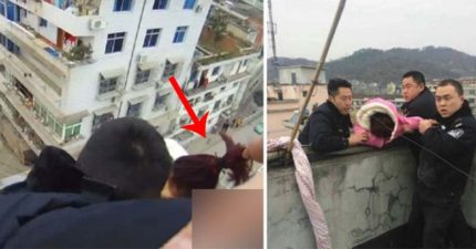 中國女不爽一個轉身跳樓自殺,老公秒「抓馬尾」驚悚救援!(影片)