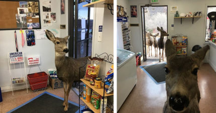 超萌鹿媽媽跑進商店逛街,30分鐘後帶小孩在門外探頭:我們也可以進去嗎?
