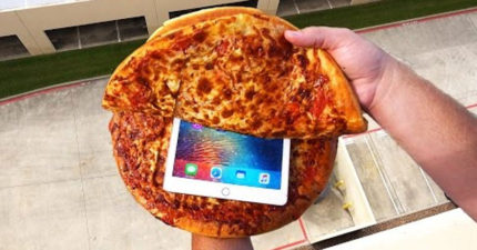 他將1台iPad放在兩片超多起司的披薩中間「然後從30公尺高空摔下」,保護效果讓人吃驚!