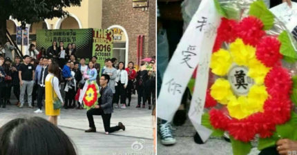 男子在眾人面前拿「喪禮用的花圈」跟女生求婚,網友:「有創意可是沒救了」