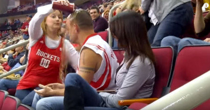 球赛亲亲镜头拍到他们,生气女友将汽水倒在男友身上。右边辣妹看不过去举动让全场爆炸!