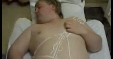 他的朋友小心翼翼地在他身上畫了一個吉他然後點了個小火,吉他高手就誕生了。