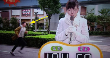 美女主播報天氣時型男從後面跑過去,網友驚叫「快!玉木宏在後面!」。原來在拍這個。